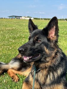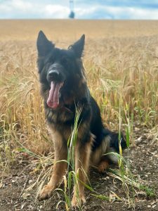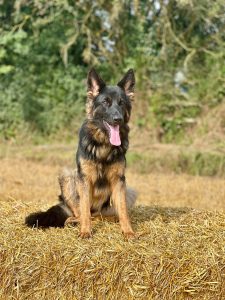 He has been brought up in a family of 4 2 children 2 other children visit from age 2, he’s been brought up with 2 other dogs since pups, he does not like cats, small animals or birds, he’s often caught pigeons in my garden, he’s fast, he’s made a race track (we call it) where the rescuer said its where he’s guarding his perimeter and why he would be better suited with a job, he will run this when we go outside, he will play fetch all day he loves to pass you things to throw for him, no health problems, he has rear dew claws .